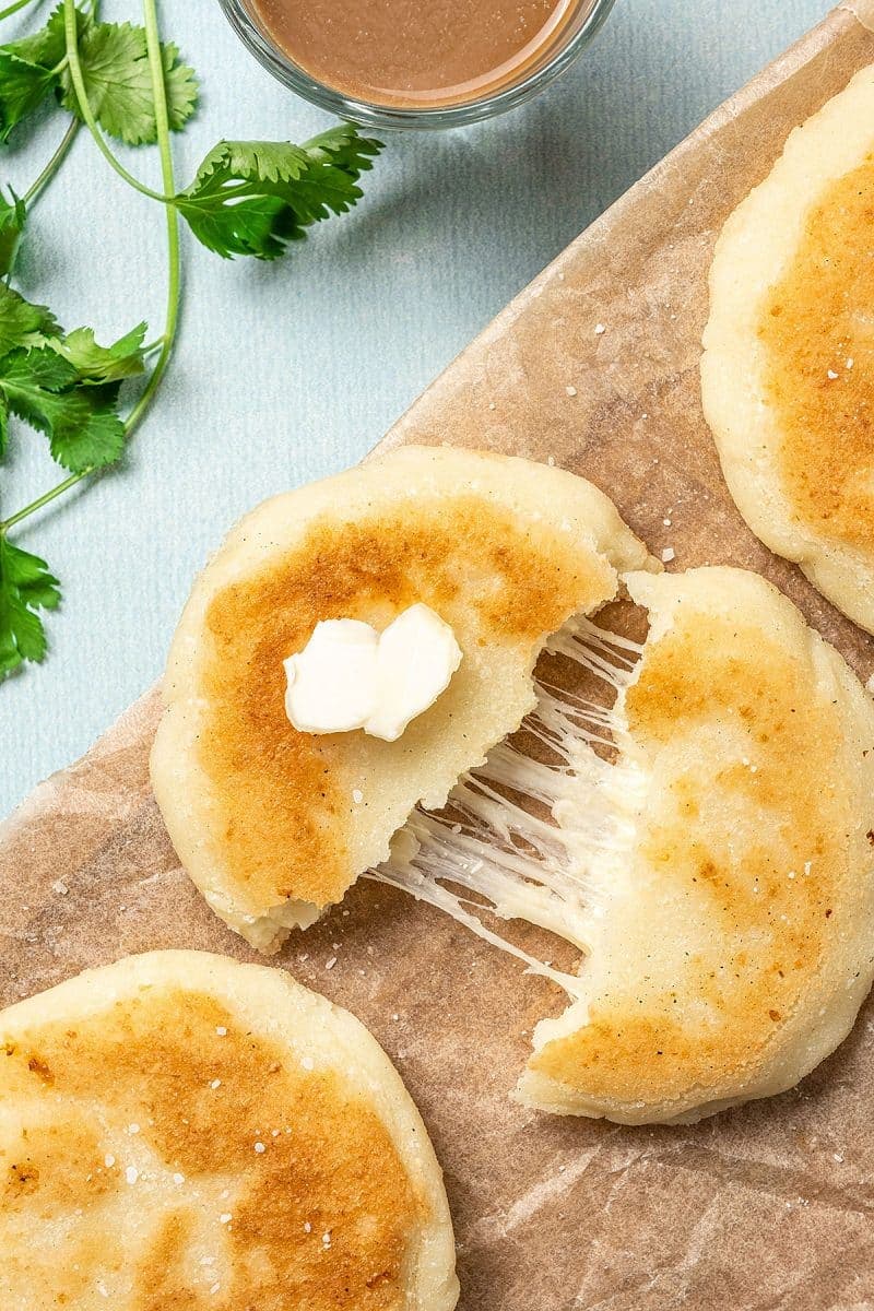 Place the arepas on the skillet or griddle and cook, moving them around occasionally for about 4-5 minutes or until golden brown. Flip and cook for about 4-5 minutes or until golden brown and crispy. Remove from the skillet and serve warm, with additional butter on top (optional).