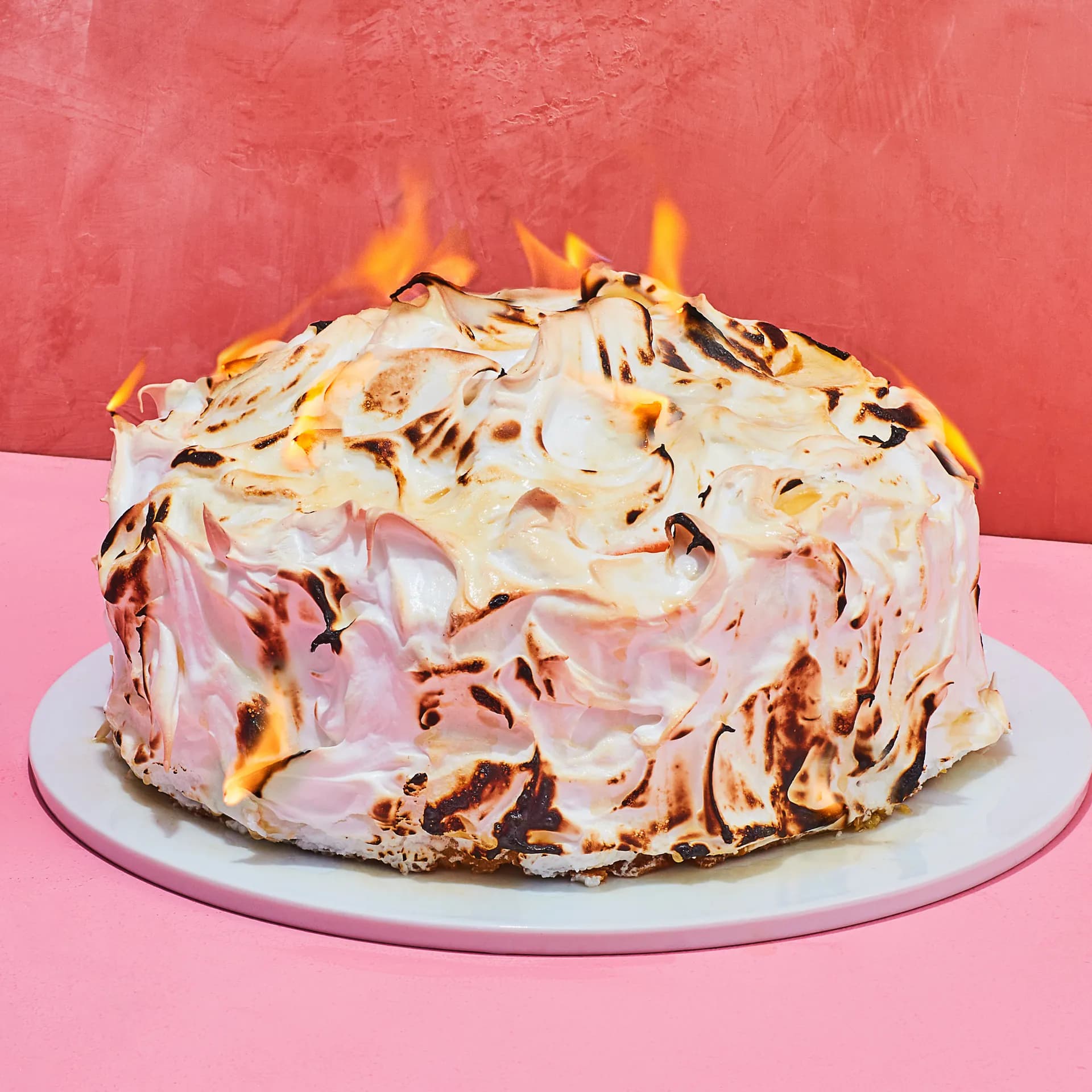 Transfer frozen cake (still on plate or inverted cake pan) to a baking sheet lined with parchment or wax paper and spread meringue over cake, making it at least 1 inch thick and mounding it on top. Make an indentation with a tablespoon in center of meringue deep enough to fit eggshell. Bake cake until edges are lightly browned, about 5 minutes. Carefully transfer cake to a serving plate using 2 metal spatulas and place eggshell in indentation. Pour liqueur into eggshell and carefully ignite with a long match or kitchen torch. Spoon flaming liqueur evenly over meringue (flaming liqueur will brown meringue a little more). Remove eggshell and serve baked Alaska immediately.