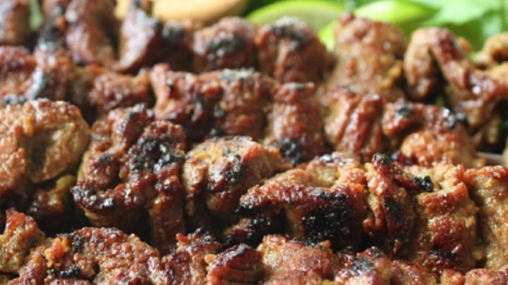 Remove beef from marinade and shake off excess marinade. Thread 1/4 the meat onto each metal skewer.