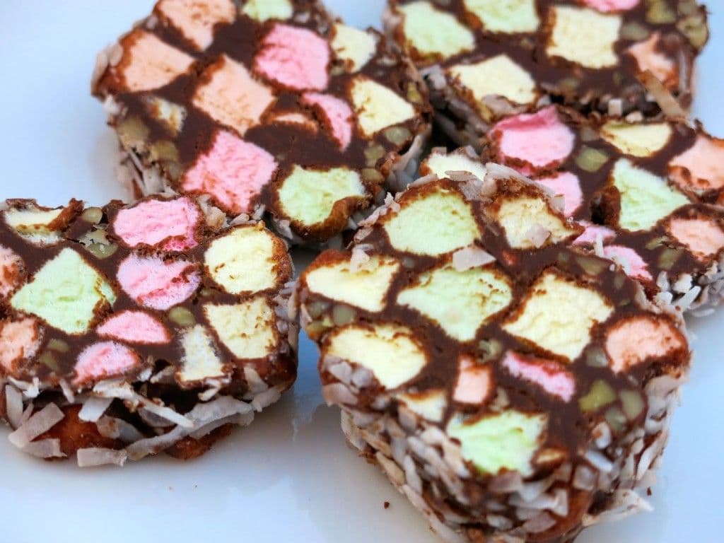 Now, this nifty little cookie gets its name because it resembles a stained glass “church” window. The chocolate will form the frame and the marshmallows are the colored “glass” inside. Take my word for it, because if you see a plate of these cookies go by, grab one. I’ve never seen anyone sit and study the design, only devour the cookie.
