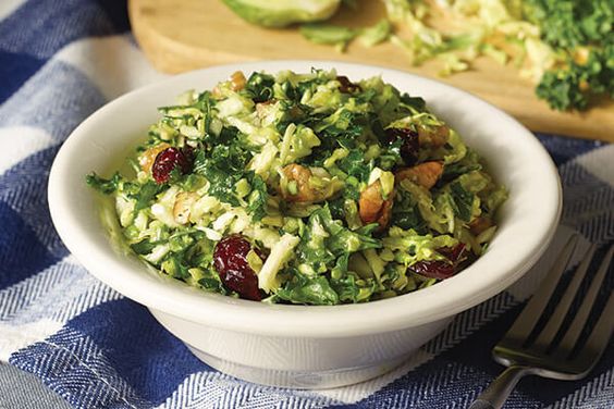 In a large bowl add 5 cups of sliced kale, 5 cups of Brussel sprouts, Craisins and pecans.