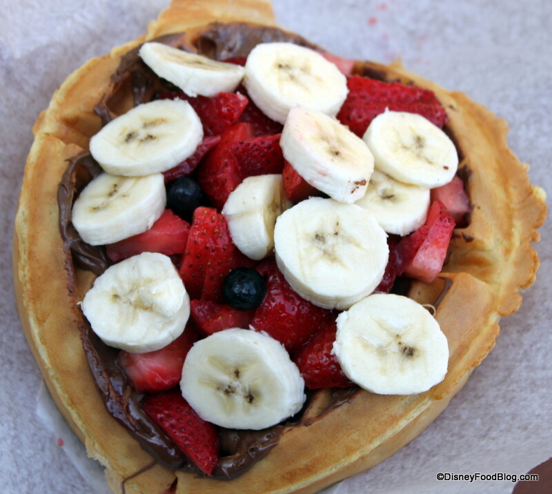 Spread a generous amount of Nutella over the surface of the waffle. Top with fresh fruit. Fold in half (if you can) or serve flat and eat with a fork and knife.