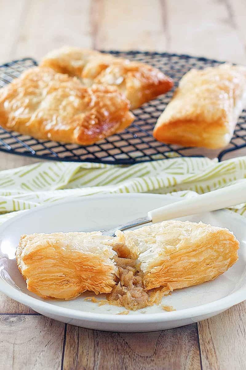Defrost the puff pastry according to package directions. Cut puff pastry into 8 squares. Spoon 1 heaping tablespoon of cooked apples onto one side of each on of the squares. Brush water on the edge of each on of the squares and fold the squares over on each other. Use a fork to crimp the edges together.