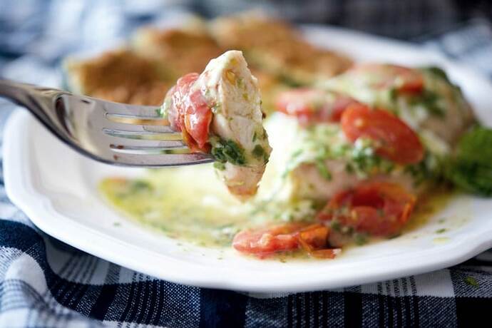 Top each chicken breast with mozzarella, pesto and then top with halved grape tomatoes.