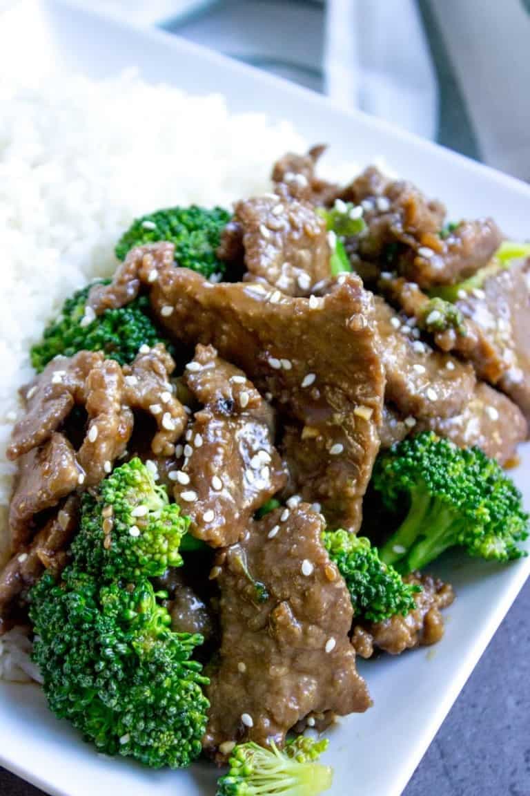 Heat wok or large skillet until it is hot. Pour in oil and swirl it around. Lay out meat in one layer and let it cook until browned. Turn over the beef slices, add the garlic and ginger, and mix around quickly. Add the broccoli. Give the finishing sauce a quick stir and pour it over the beef and broccoli. Stir everything together until the sauce thickens. Serve over rice.