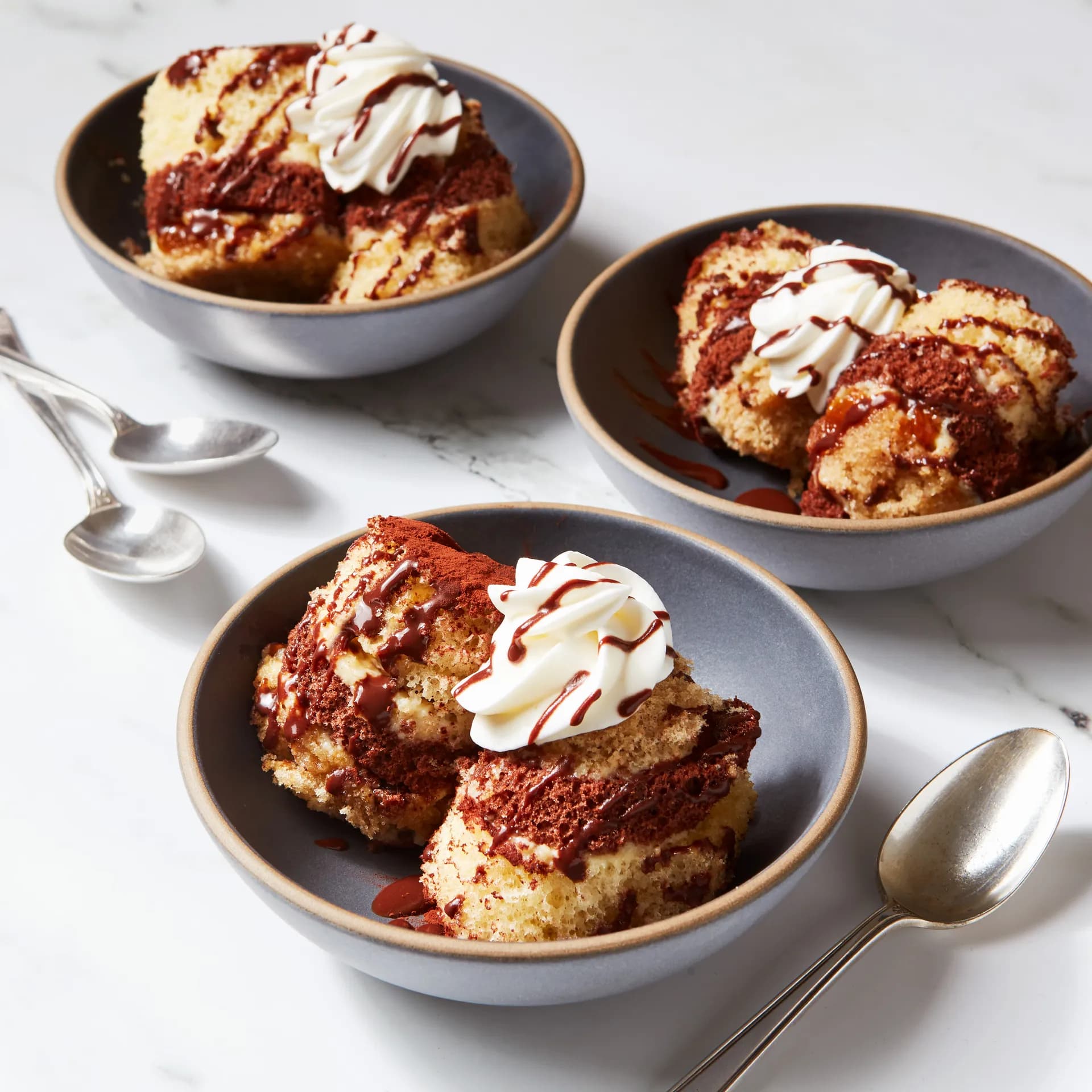 For each serving, using a 2-inch diameter ice-cream scoop or large dessert spoon, scoop 2 or 3 “dumplings” from the cake and stack in a soup bowl or on a plate. Transfer the whipped cream to a pastry bag fitted with a 9/16-inch-wide open-star tip, such as Ateco Number 825. Pipe whipped cream rosettes on top, and drizzle the rum chocolate sauce over all. Serve chilled.