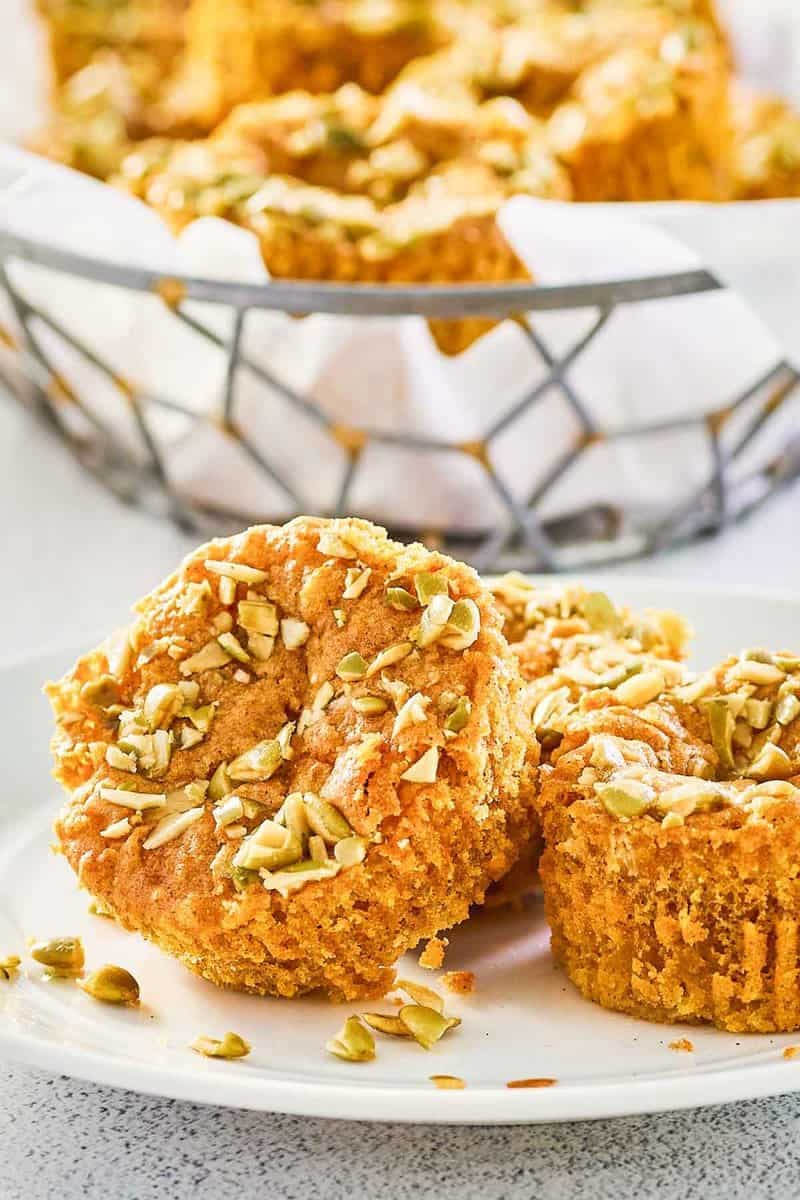 Sprinkle the chopped pepitas around the edge of each muffin.