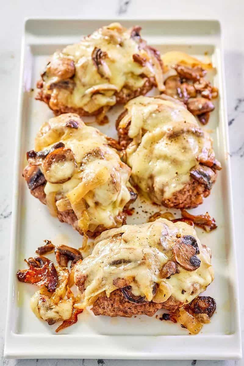 Cover chopped steaks with onion mushroom mixture and place slice of Monterrey Jack cheese over each one. Return for 1-2 minutes in hot oven.