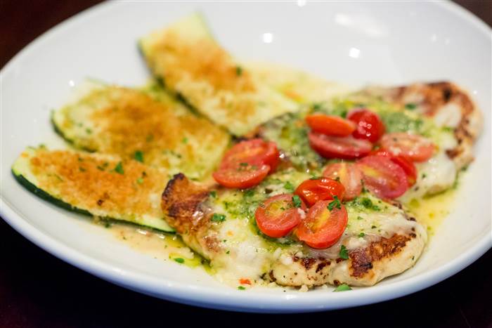 The chicken margherita consists of grilled chicken breasts topped with fresh grape tomatoes, mozzarella, basil pesto and lemon garlic sauce.
