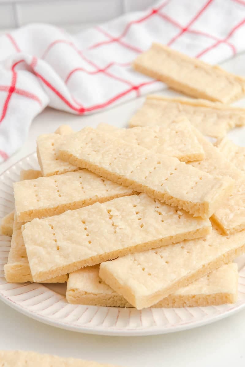 Using a sharp knife, make 5 even cuts parallel to the length of the pan, dividing the shortbread in 6 equal strips (the strips should be about 1 1/2 x 13 inches). Then make 2 even cuts parallel to the width of the pan, dividing each long strip into thirds. This will make 18 pieces of shortbread, each about 1 ½ x 4 inches.
